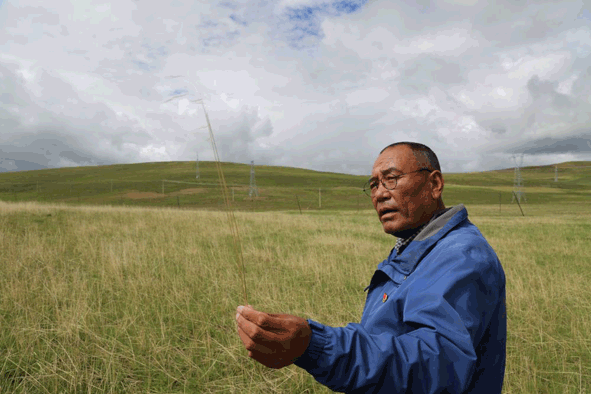 羅日蓋在查看達(dá)日草原的牧草生長(zhǎng)情況。新華社 劉紅 攝