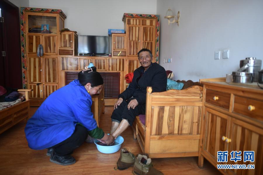3月14日,幸福敬老院一名護(hù)工為索保尼瑪老人洗腳。新華社記者 張宏祥 攝