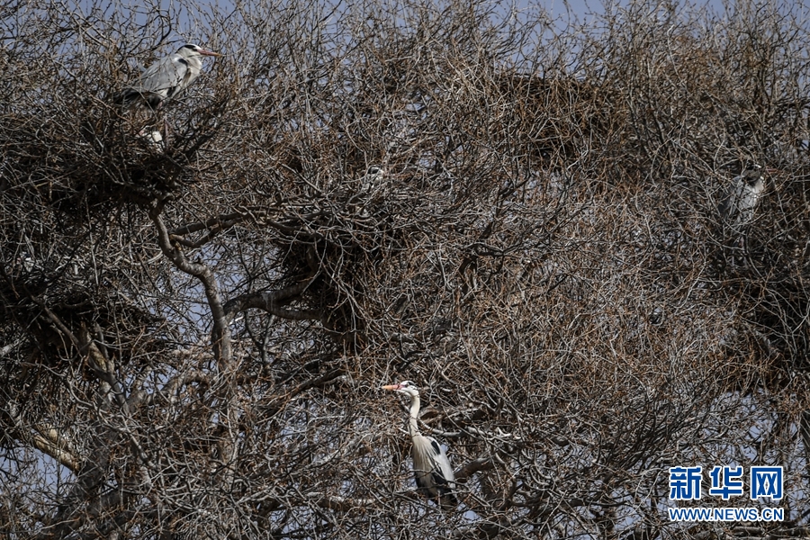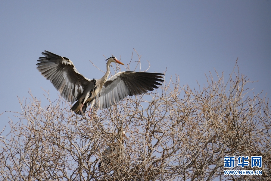兩只蒼鷺來(lái)回飛舞忙碌建巢。新華網(wǎng) 卡婭梅朵 攝