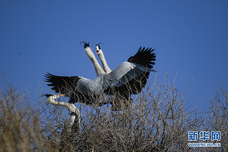 三只蒼鷺在樹梢嬉戲。新華網(wǎng) 潘彬彬 攝