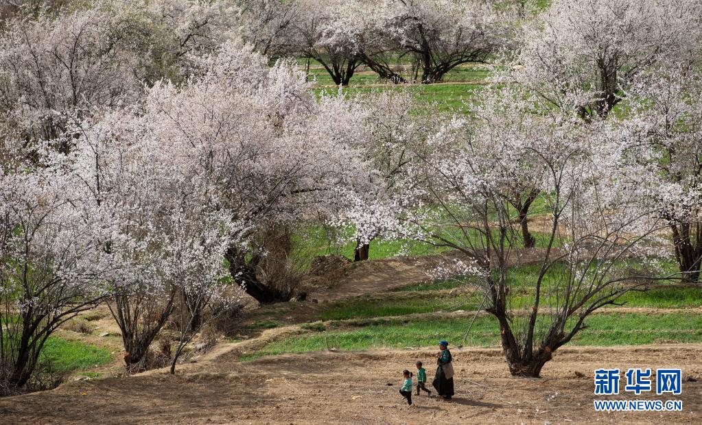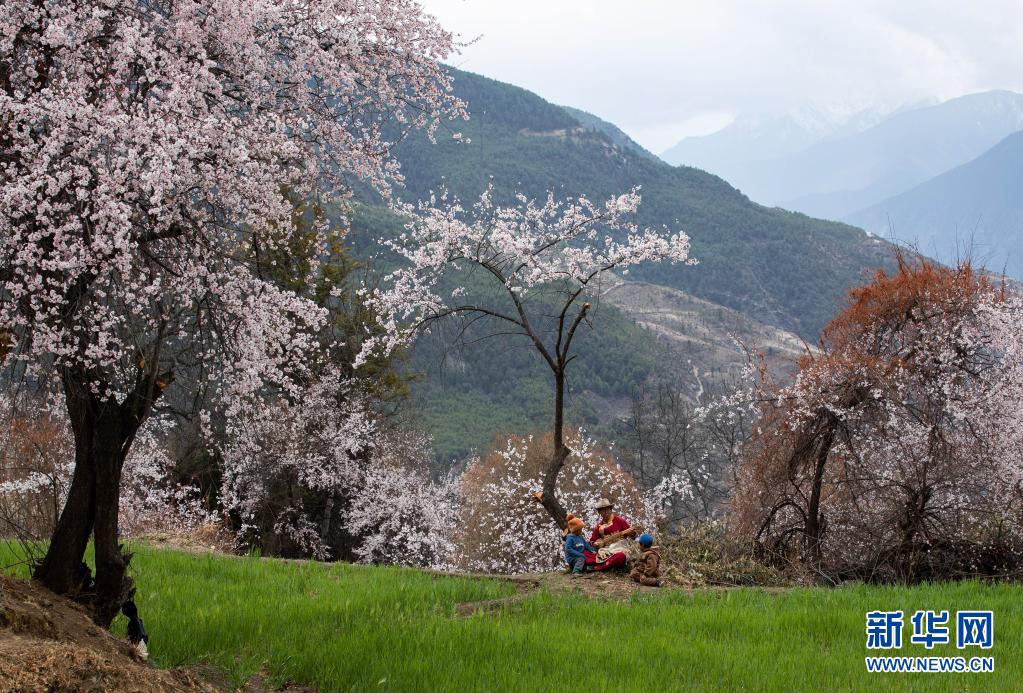 4月3日,一位藏族阿媽帶著兩個(gè)孫兒走在白松鎮(zhèn)日當(dāng)村桃花林下。新華社記者 江宏景 攝