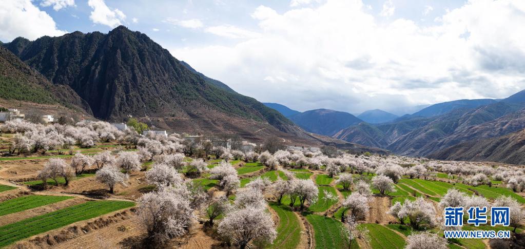 4月3日拍攝的得榮縣白松鎮(zhèn)日當(dāng)村桃花林一角(無(wú)人機(jī)照片)。新華社記者 江宏景 攝