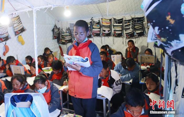 5月24日,瑪多縣民族寄宿制中學的學生在帳篷教室內(nèi)上課。當日,青海省果洛藏族自治州瑪多縣學生復課。 中新社記者 馬銘言 攝