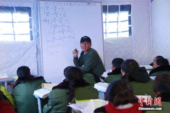 5月24日,瑪多縣民族寄宿制中學的老師在帳篷教室內(nèi)講課。當日,青海省果洛藏族自治州瑪多縣學生復課。 中新社記者 馬銘言 攝