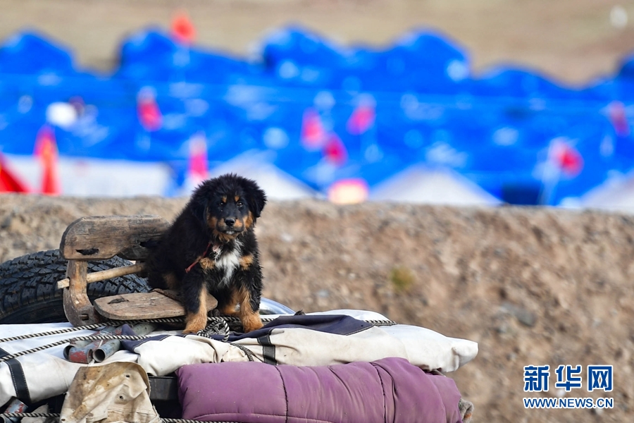 5月26日,一名受災(zāi)群眾將家中的物資和狗狗拉至瑪多縣黃河鄉(xiāng)安置點。
