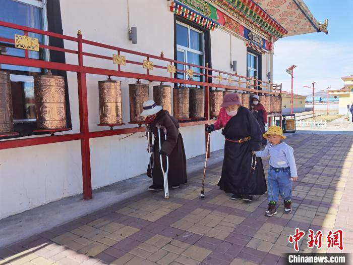 上午十點(diǎn),長(zhǎng)江源頭的青海玉樹治多縣幸福敬老院內(nèi),陽光靜靜普照小廣場(chǎng),金色轉(zhuǎn)經(jīng)筒邊身著藏袍的老人彎腰拄拐,牽著吃糖的孩子悠悠踱步,遠(yuǎn)處皚皚雪山起伏。