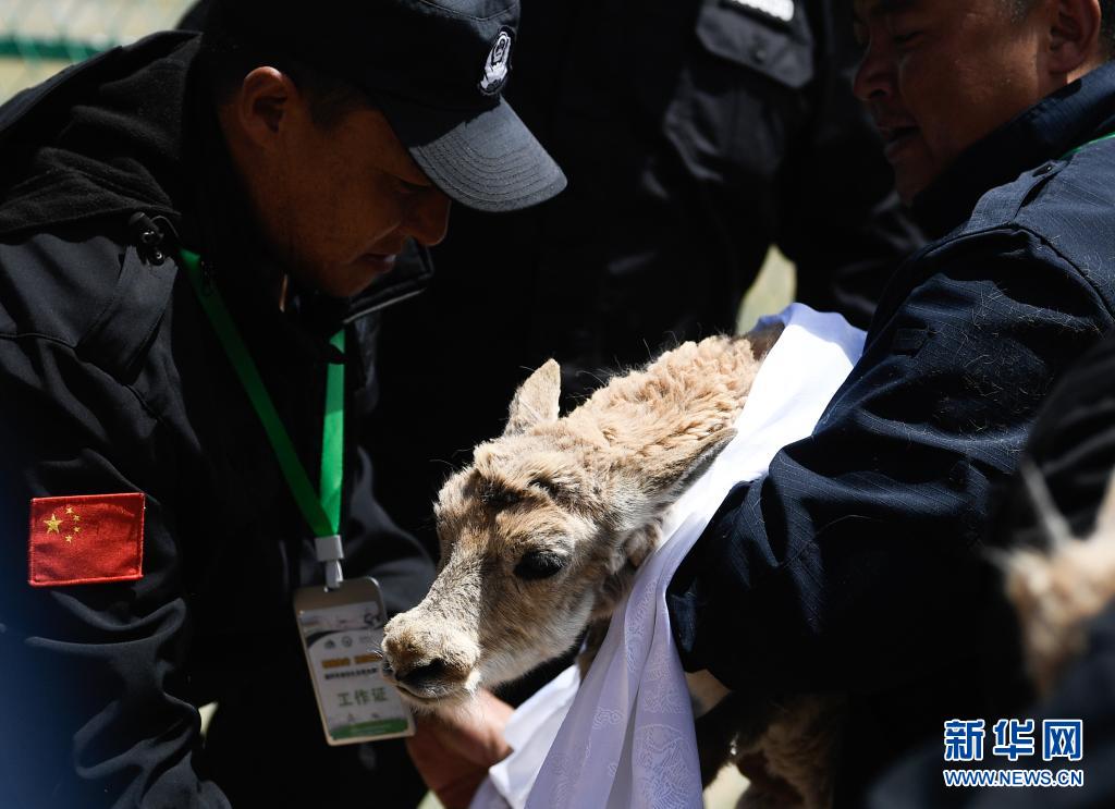 7月7日,在可可西里索南達(dá)杰保護(hù)站野生動(dòng)物救助中心,可可西里巡山隊(duì)員按照風(fēng)俗為放歸的藏羚羊戴上哈達(dá)表達(dá)祝福。新華社記者 張龍 攝