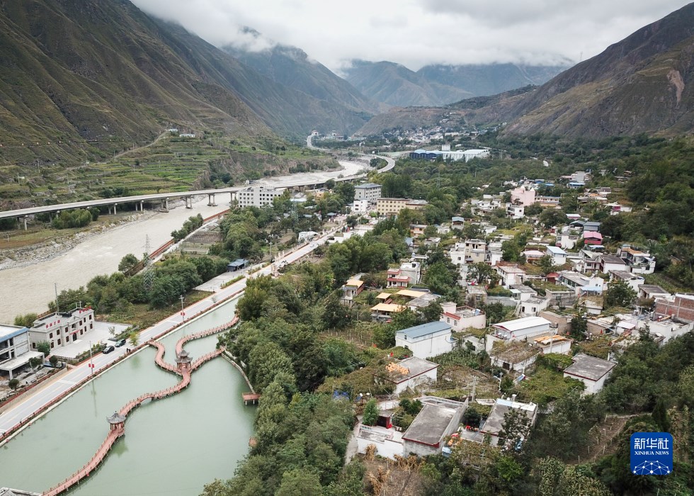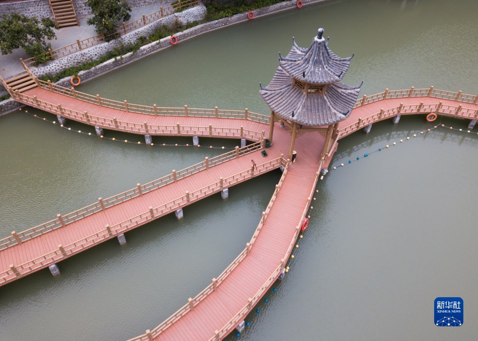 這是10月13日在舟曲縣大川鎮(zhèn)土橋子村拍攝的田園觀光體里的水上步道(無人機照片)。新華社記者 馬希平 攝