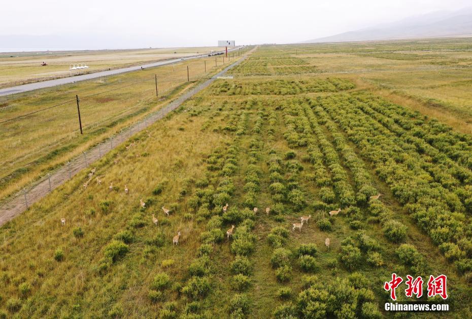 9月27日,在青海省海南藏族自治州共和縣青海湖國家級自然保護(hù)區(qū)南岸保護(hù)站,普氏原羚在草場內(nèi)進(jìn)食。(無人機(jī)照片) 中新社記者 馬銘言 攝