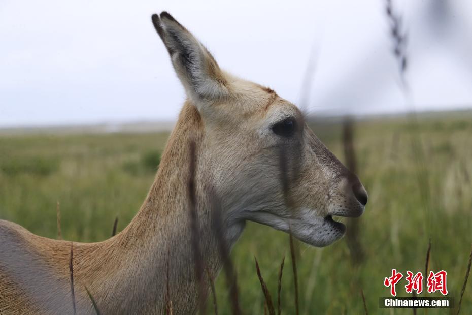 9月27日,在青海省海南藏族自治州共和縣青海湖國家級自然保護(hù)區(qū)南岸保護(hù)站,普氏原羚在草場內(nèi)進(jìn)食。 中新社記者 馬銘言 攝
