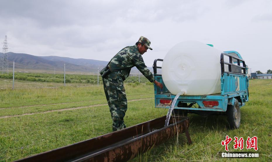 9月27日,在青海省海南藏族自治州共和縣青海湖國家級自然保護(hù)區(qū)南岸保護(hù)站內(nèi),管護(hù)員往普氏原羚的水槽內(nèi)添水。中新社記者 馬銘言 攝