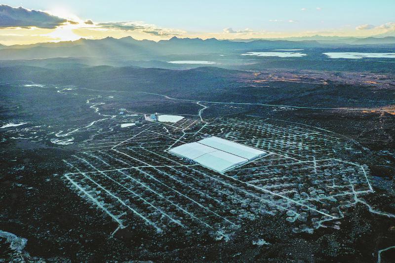 10月11日,無人機航拍的水切倫科夫探測器陣列,探測器總面積為7.8萬平方米,由兩個150米× 150米和一個300米× 110米水池組成。