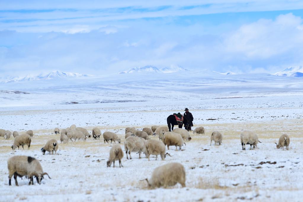 10月20日,在瑪多縣扎陵湖鄉(xiāng),牧民正在放牧。(新華社記者 張龍 攝)