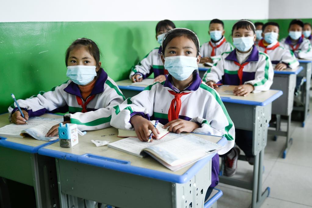 9月1日,在位于果洛藏族自治州瑪沁縣的瑪多地震災(zāi)后過渡安置一校區(qū),學(xué)生在上開學(xué)第一課。(新華社記者 張龍 攝)