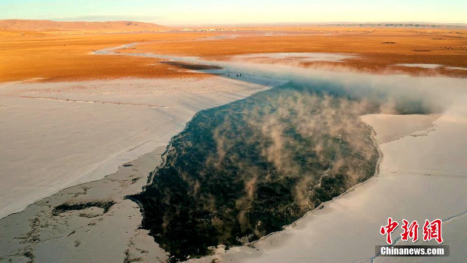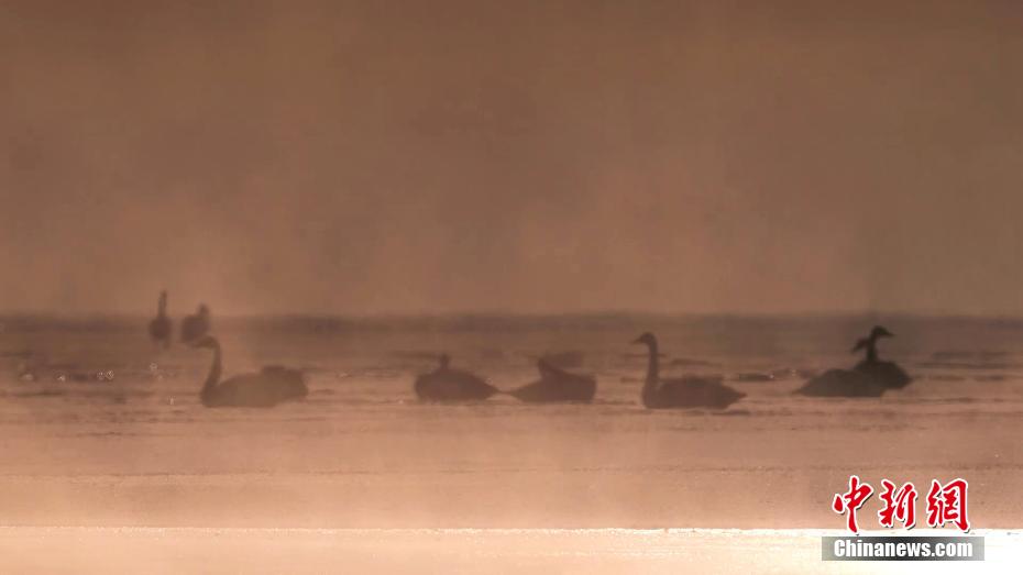 在冬日晨曦,初升的暖陽下黑馬河水汽升騰,成群的大天鵝宛如仙子沐浴出水,畫面唯美。馬海青 攝