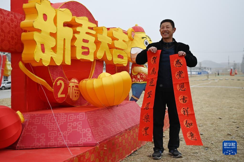 1月25日,在蘭州新區(qū)舟曲避險搬遷安置點,搬遷群眾展示領取的春聯(lián)。新華社記者 范培珅 攝
