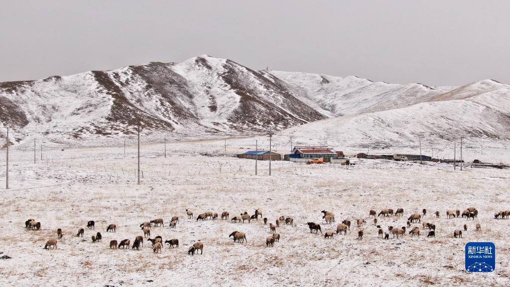 3月31日,青海省黃南藏族自治州河南蒙古族自治縣,一群歐拉羊在雪后的草原上吃草(無(wú)人機(jī)照片)?!⌒氯A社記者 王艷 攝