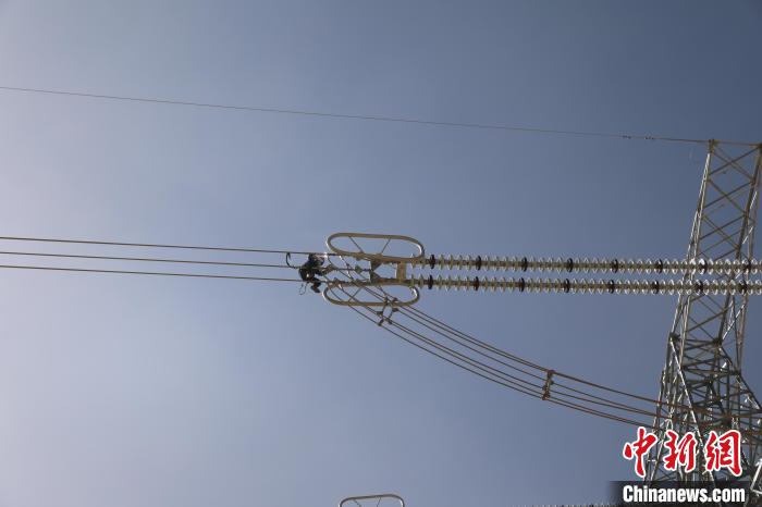 圖為國(guó)網(wǎng)青海超高壓公司輸電專業(yè)人員正在開展750千伏青塔I線14號(hào)鐵塔消缺工作。 董慶芳 攝