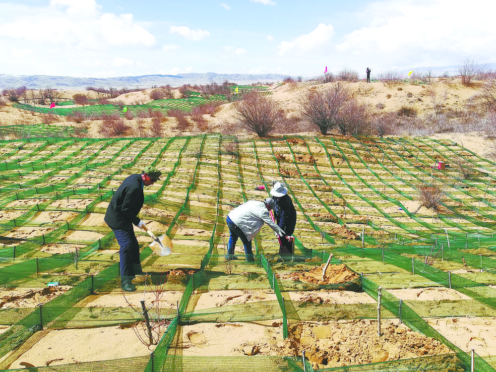 陶銳說:“比如在流動(dòng)半流動(dòng)沙丘,我們將工程固沙與生物治沙相結(jié)合。在迎風(fēng)面設(shè)置1.5m×1.5m的草方格沙障,在設(shè)置好的草方格沙障內(nèi)栽植青楊,進(jìn)行烏柳插桿并點(diǎn)播檸條沙蒿等,而在背風(fēng)坡實(shí)行插桿造林。在丘間地,我們則采取植苗造林,栽植烏柳苗和沙棘苗,并用網(wǎng)圍欄進(jìn)行封育等。”