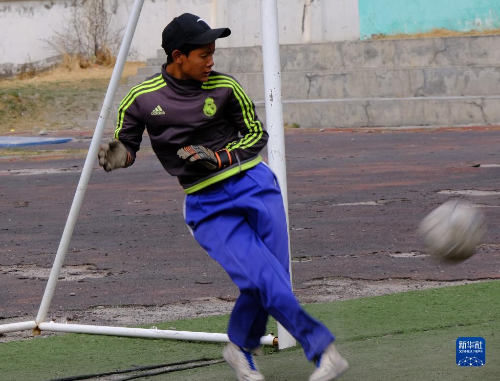 4月18日,稱多縣文樂中心寄校足球社團的學生在守門。新華社記者 央秀達珍 攝