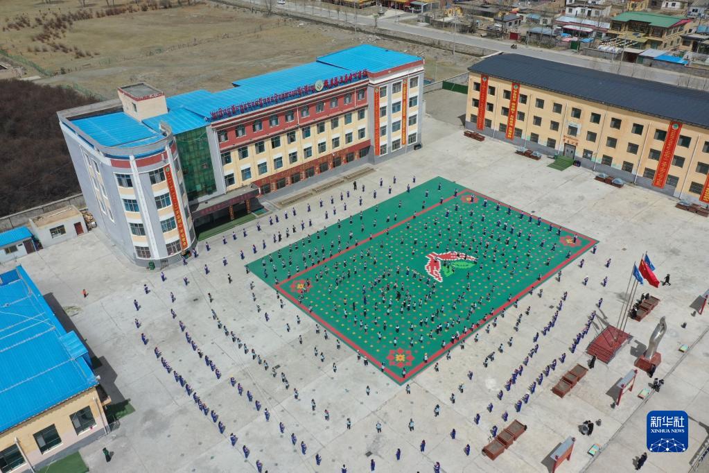4月18日,稱多縣文樂中心寄校的學生們跳操(無人機照片)。新華社記者 韓方方 攝