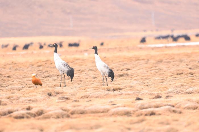 圖為黑頸鶴與灰鶴。青海多美生態(tài)環(huán)??萍加邢薰?供圖