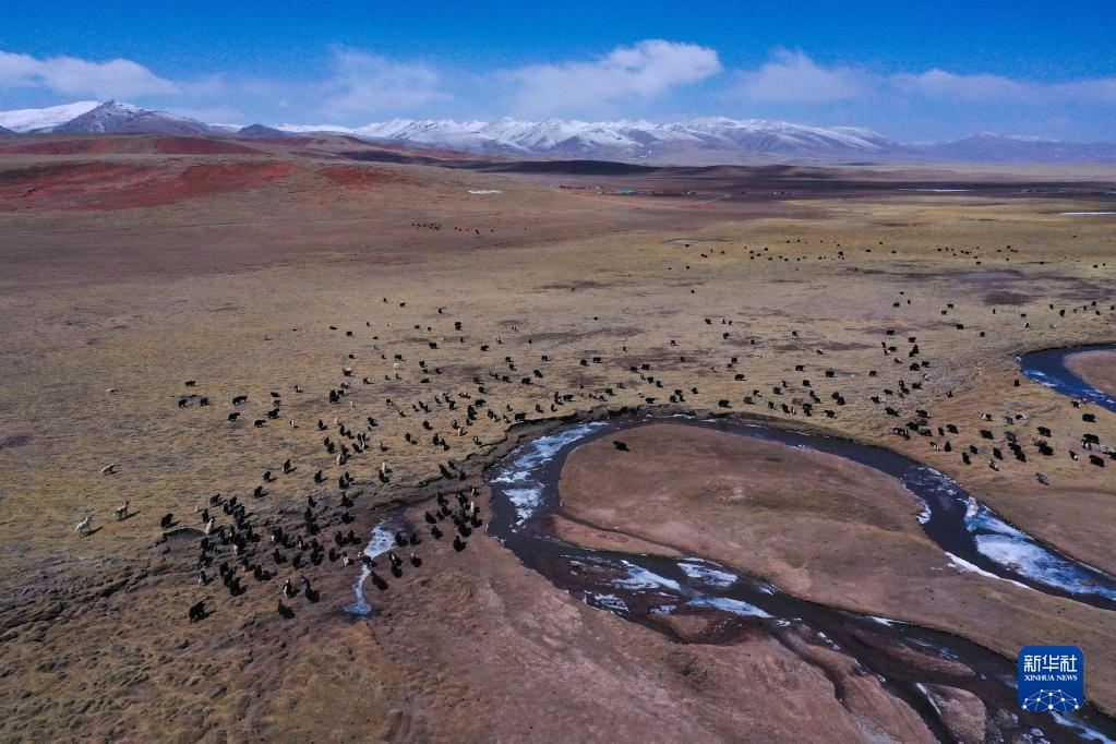 4月19日,在青海省玉樹藏族自治州治多縣,牦牛在覓食(無(wú)人機(jī)照片)。新華社記者 張龍 攝