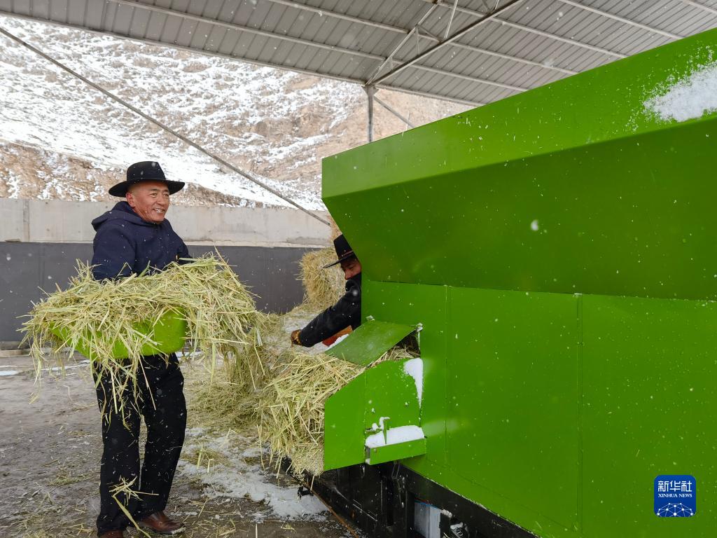4月27日,在青海省玉樹藏族自治州稱多縣三江源高原現(xiàn)代生態(tài)牧業(yè)示范點(diǎn),昂巴拉農(nóng)牧民專業(yè)合作社理事長(zhǎng)布德在處理草料。新華社記者 柳澤興 攝