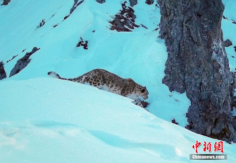 近日,大熊貓國家公園王朗片區(qū)在回收高山紅外相機時,發(fā)現再次拍到國家一級保護動物雪豹的活動影像。紅外相機視頻時間顯示,此次獲得的雪豹影像拍攝于2021年11月,工作人員通過斑點比對,確定該雪豹為去年首次拍攝到的兩只雪豹中的一只。圖為紅外相機拍攝到的雪豹影像。 大熊貓國家公園王朗片區(qū) 供圖