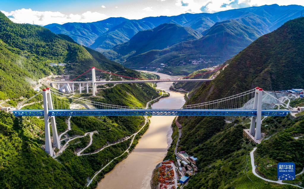 7月27日拍攝的麗香鐵路金沙江特大橋(無人機(jī)照片)。大橋左邊連接哈巴雪山隧道,右邊連接玉龍雪山隧道。新華社記者 陳欣波 攝