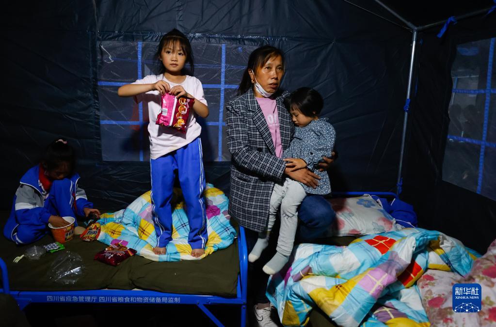 9月5日晚,在四川甘孜州瀘定縣磨西鎮(zhèn)的受災(zāi)群眾臨時(shí)安置點(diǎn),受災(zāi)群眾在帳篷里。新華社 沈伯韓 攝