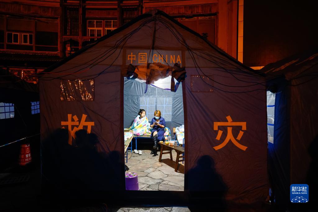 9月5日晚,在四川甘孜州瀘定縣磨西鎮(zhèn)的受災(zāi)群眾臨時(shí)安置點(diǎn),人們?cè)诖罱◣づ?。新華社 沈伯韓 攝