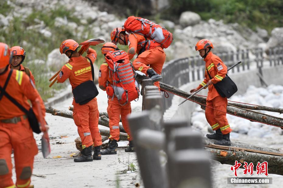 9月6日,四川甘孜州瀘定縣磨西鎮(zhèn),甘孜州森林消防支隊康定中隊隊員通過簡易木橋,深入山區(qū)開展救災(zāi)工作。9月5日,四川瀘定發(fā)生6.8級地震。 中新社記者 張浪 攝