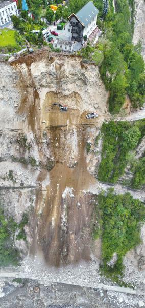 距磨西鎮(zhèn)1公里處的斷道點(diǎn),7.5米寬的公路路面,只剩下不到一半。剩余的路面呈懸空狀態(tài),下面是300米深的崖谷。受損如此嚴(yán)重,這段公路短期內(nèi)無(wú)法原路修復(fù),須另修一條便道,避開斷道點(diǎn)。