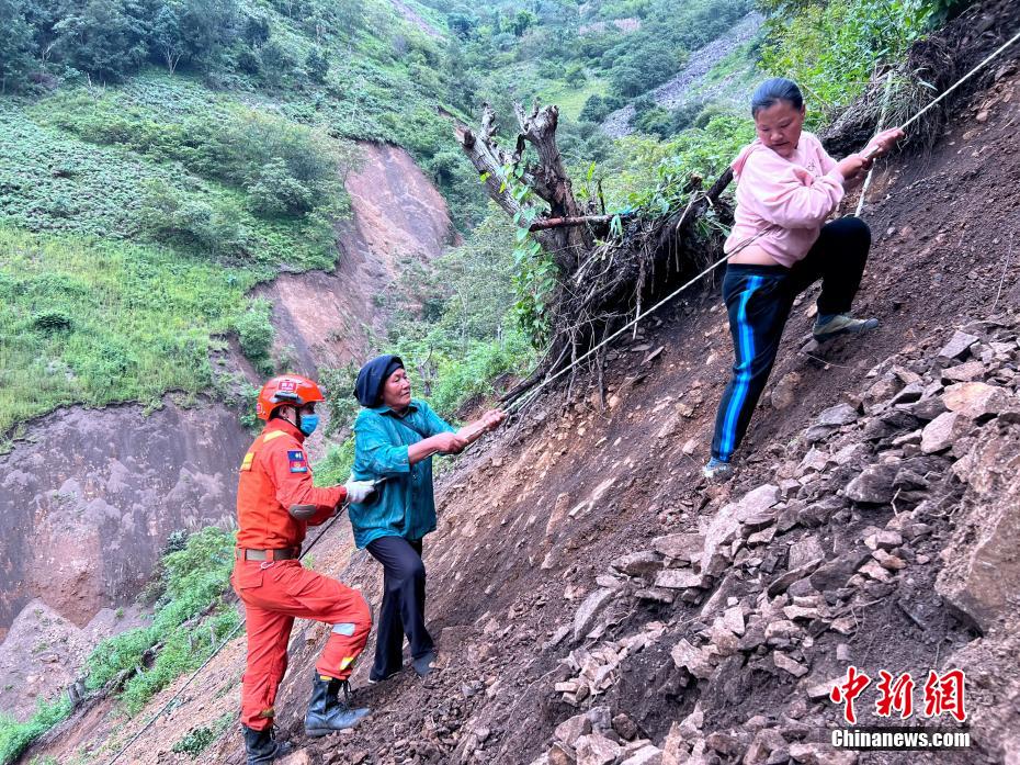 救援人員護(hù)送村民通過垮塌路段,安全下山。譚昊 攝