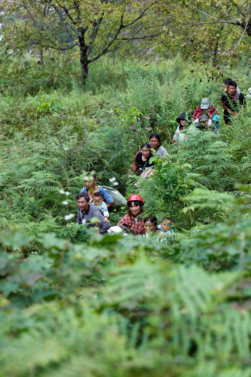 穿越了十余個(gè)這樣的路段,遠(yuǎn)遠(yuǎn)看到山下有人影晃動(dòng)在齊人高的綠色植物之間,再往山上走。向?qū)дf他們是從灣東村一組上來的被困群眾。透過長(zhǎng)焦鏡頭看到,一名精壯的小伙子赤裸上身,拿著鐮刀走在最前面為鄉(xiāng)親們開路,鄉(xiāng)親們跟在后頭,有的還背著孩子。幾名救援人員在變形的公路護(hù)欄旁接爬上來的人,一名背著孩子的婦女一握到解放軍戰(zhàn)士的手就哭了出來……待這批村民全部上到公路上后,救援人員護(hù)送他們返回紅花崗附近可以停直升機(jī)的疏散地點(diǎn),然后再去山下接人。