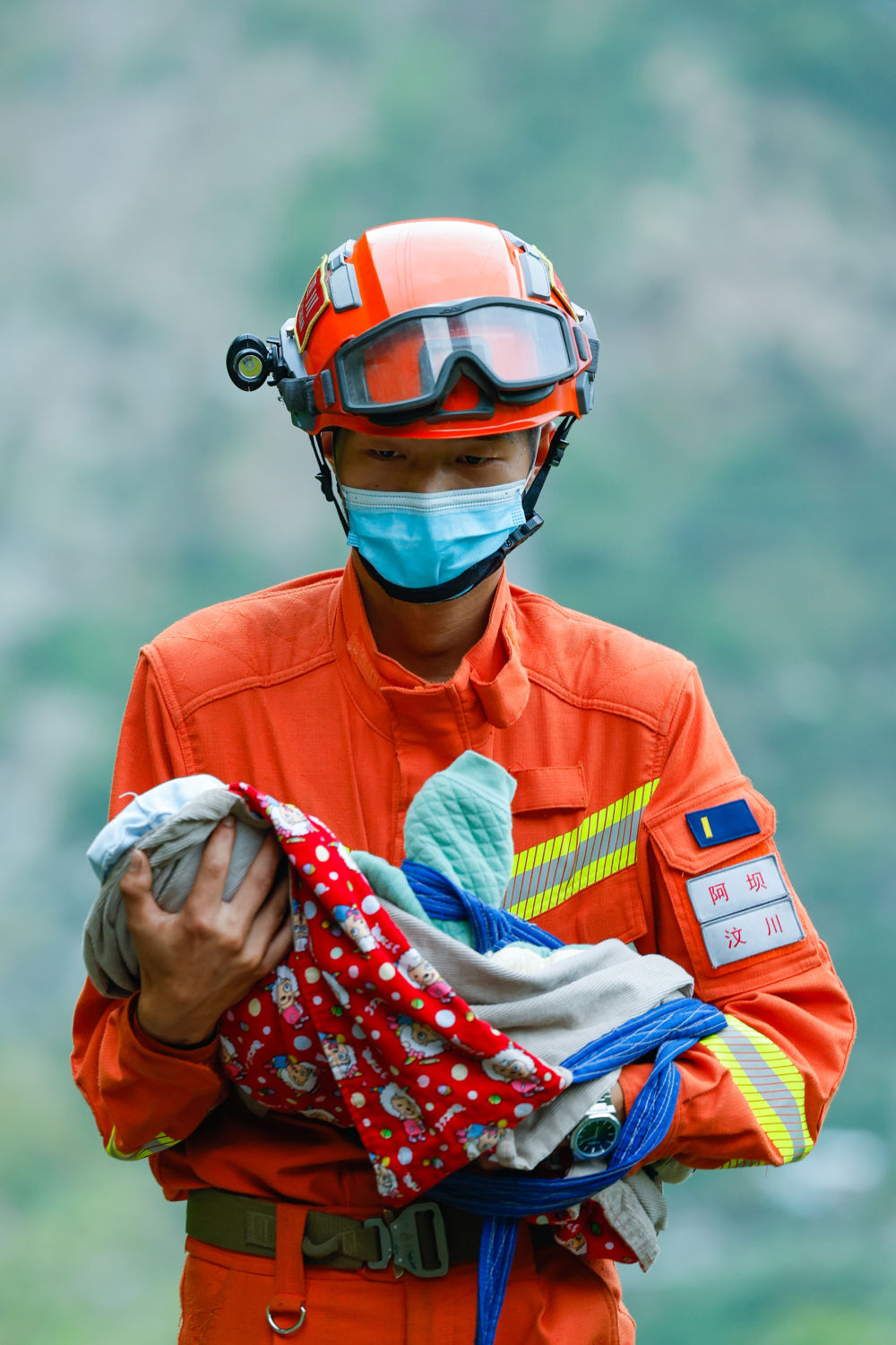 我一路小跑到消防員前面一段距離,拿起帶著長(zhǎng)焦鏡頭的相機(jī),蹲下,拍攝,再向前跑一段,再蹲下,再拍攝。經(jīng)歷了一天差不多10個(gè)小時(shí)的徒步、拍攝,此時(shí)我的體力確實(shí)有些跟不上,為了保證能把這個(gè)場(chǎng)景拍好,只能多拍一些,不留遺憾。消防員沿著土路折了幾道彎才走到聯(lián)合村隧道口的大路,把嬰兒交給值守在那里的瀘定縣人民醫(yī)院的醫(yī)護(hù)人員。此時(shí)我才有時(shí)間和他簡(jiǎn)單聊了聊。他叫張自立,來自阿壩森林消防支隊(duì)汶川大隊(duì),2個(gè)月大的嬰兒來自重災(zāi)區(qū)灣東村。經(jīng)過包括新華社、人民日?qǐng)?bào)、央視等媒體對(duì)這張照片的傳播,他第二天就成了大家口中的“汶川哥哥”。