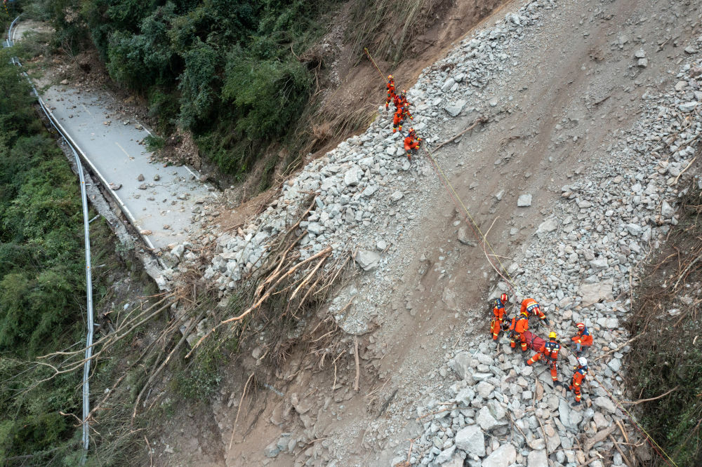 9月6日,救援人員抬著一名從灣東村疏散出來的受傷村民,準(zhǔn)備通過直升機(jī)將其運(yùn)出。