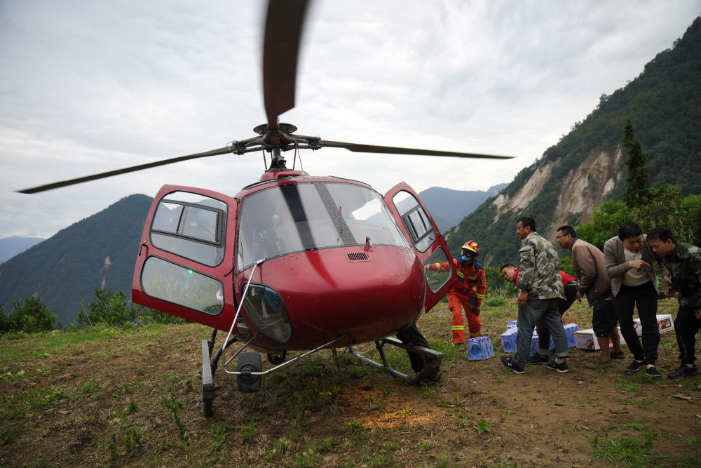 9月7日,搭載方便面和帳篷等救援物資的直升機(jī)抵達(dá)石棉縣草科鄉(xiāng),當(dāng)?shù)厝罕姲徇\(yùn)物資。