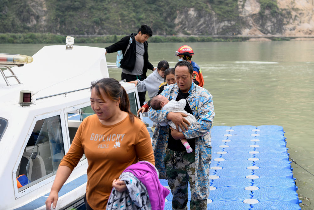 ↑9月8日,在四川石棉縣新民鄉(xiāng)臨時(shí)碼頭,救援人員駕駛沖鋒舟護(hù)送受災(zāi)群眾回家。