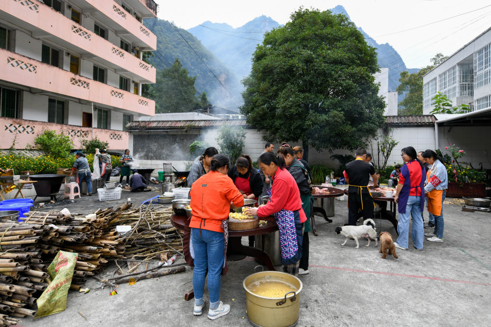 9月7日,在草科鄉(xiāng)政府安置點(diǎn)內(nèi),當(dāng)?shù)厝罕姙樵趫?chǎng)救援人員準(zhǔn)備飯菜。