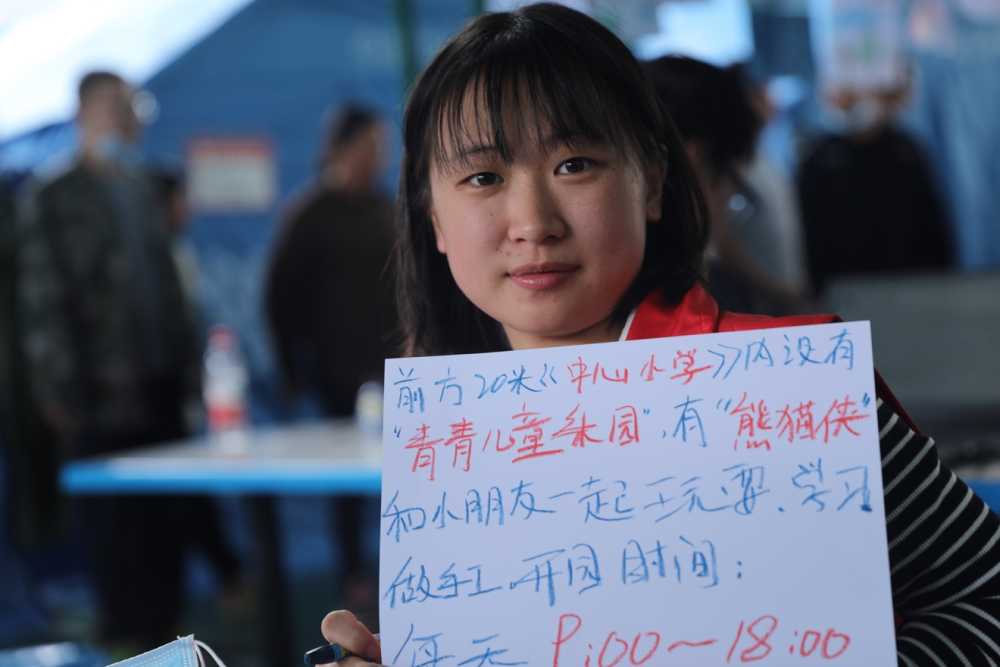 看到我手里的照相機(jī),他們十分好奇。一位叫駱雅萱的小朋友拉了拉我的衣角說:“姐姐,我想用你的相機(jī)給‘熊貓俠’拍一張照片好嗎?”“熊貓俠”是這里的一名志愿者,地震發(fā)生以來一直在安置點(diǎn)陪伴著小朋友們,大家都很喜歡她。我答應(yīng)了小朋友的請(qǐng)求,教她按下快門,看到自己拍的照片,她開心地給“熊貓俠”展示。