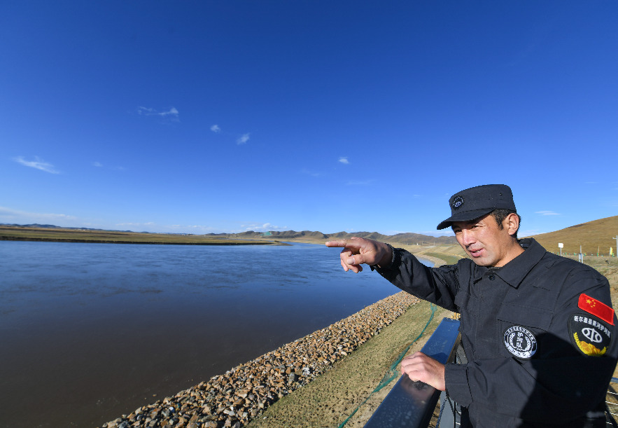 在四川省阿壩州若爾蓋縣,護河隊隊員在黃河邊觀察情況。新華社記者 王曦 攝