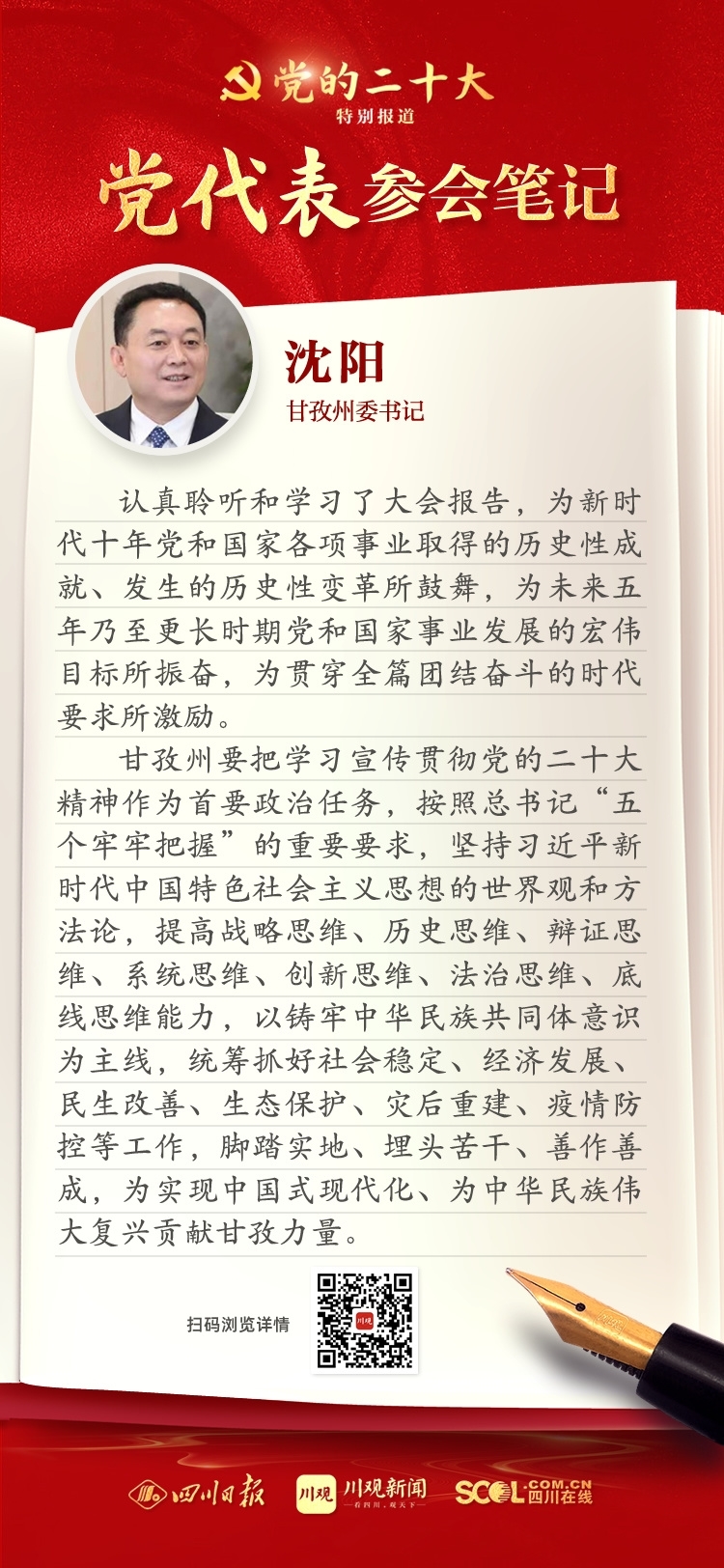 出席盛會,來自四川的黨代表深感使命光榮、責(zé)任重大,大家認(rèn)真履職,結(jié)合報(bào)告談?wù)J識、談體會、談打算。川觀新聞特此推出“黨代表參會筆記”欄目,分享黨代表們的參會心得,敬請垂注。