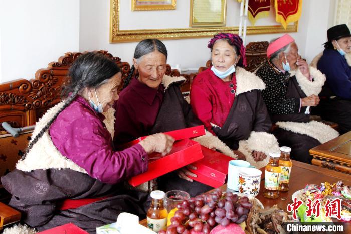 圖為同仁市社會福利服務中心的老年人拆開自己的新春禮物。馬芝芬 攝