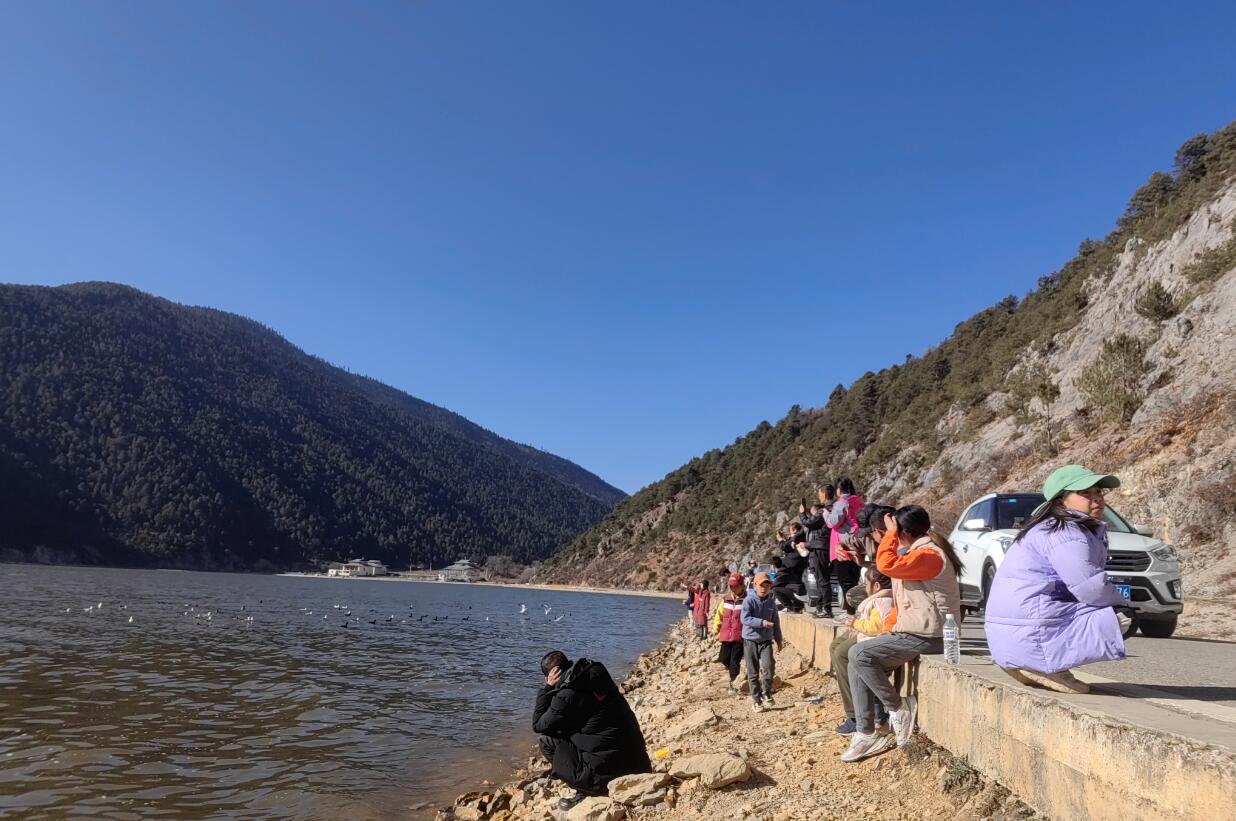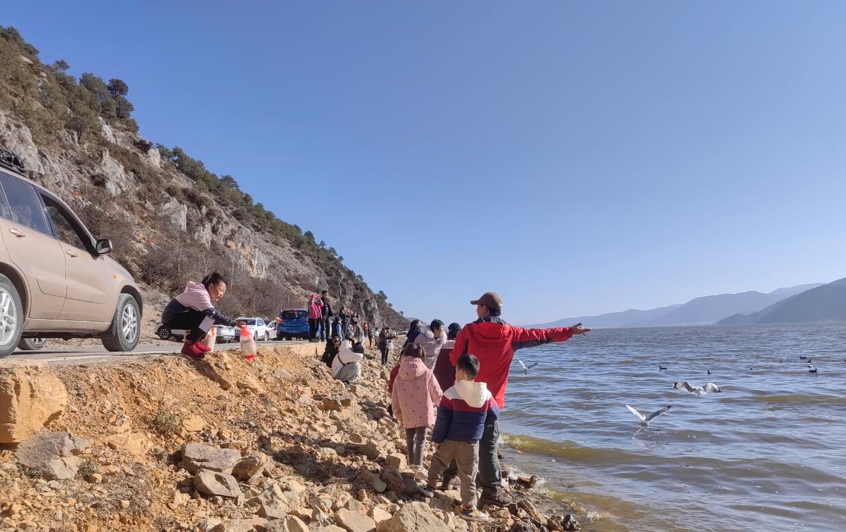 1月28日,記者在納帕海自然保護區(qū)看到成群的海鷗在這里盤旋飛舞,不少游客手托面包進行投喂,一幅幅人與自然和諧共生的美好畫卷徐徐鋪開?!暗谝淮蝸硐愀窭锢吹讲簧儆慰驮谶@里投喂海鷗,我也買一袋來試試。”游客王鑒詳說。