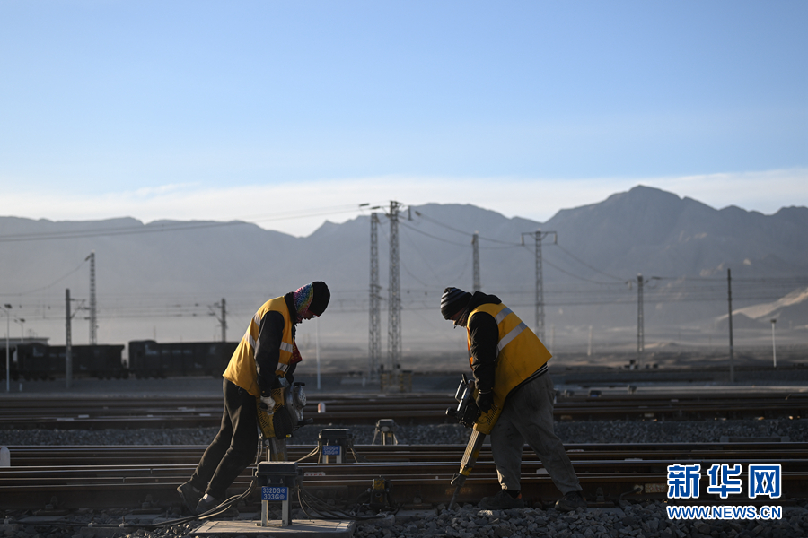 2月7日,中國鐵路青藏集團有限公司格爾木工務段格南線路工區(qū)的職工在格爾木南站施工。新華社記者 張龍 攝