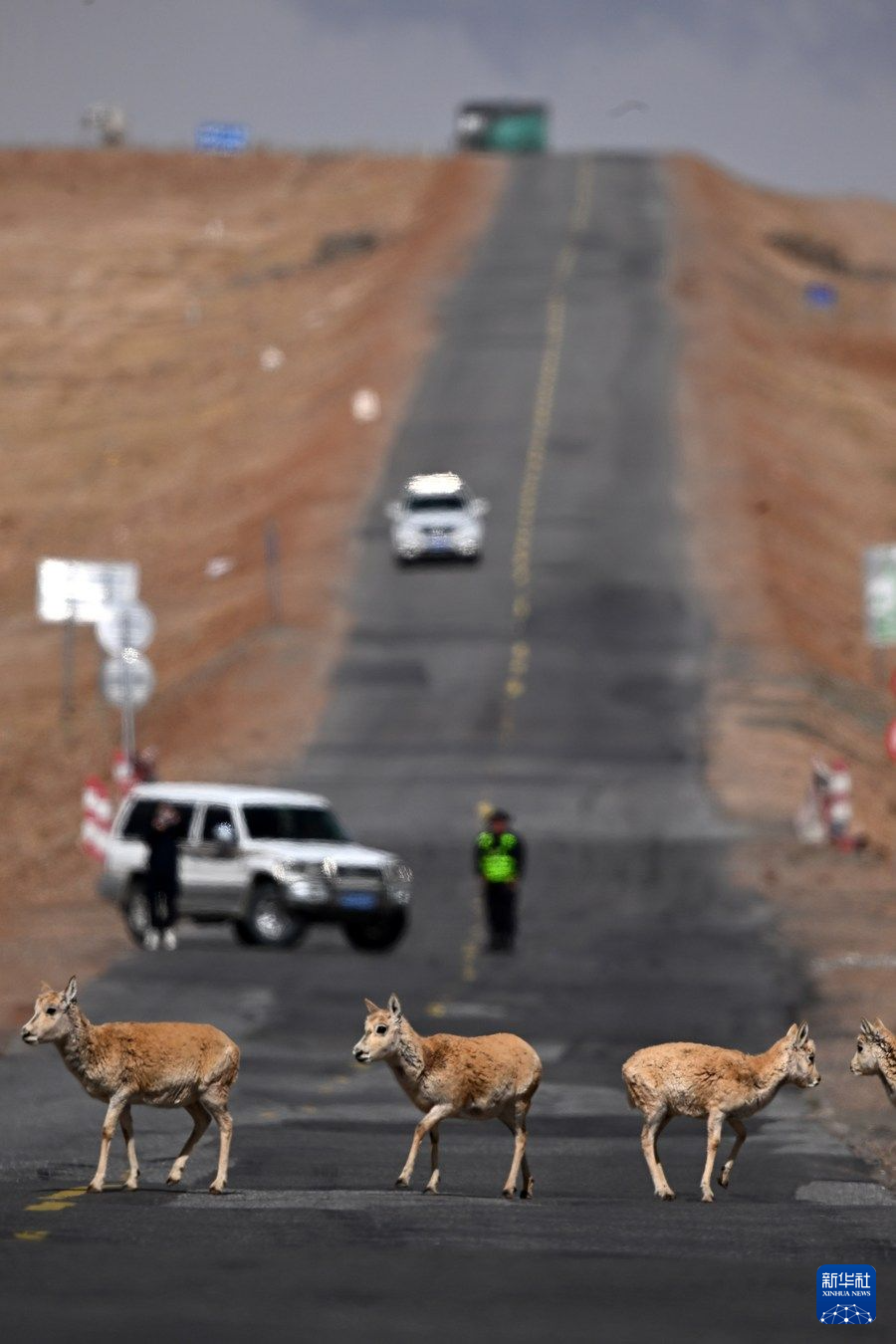 眼下,可可西里藏羚羊進(jìn)入遷徙產(chǎn)仔高峰期,記者近日在青藏公路3001公里處看到,成群的雌性藏羚羊在公路一側(cè)集結(jié),現(xiàn)場(chǎng)的工作人員對(duì)往來(lái)車輛進(jìn)行臨時(shí)交通管制。頭羊反復(fù)試探、確認(rèn)沒(méi)有危險(xiǎn)后,羊群快速通過(guò)公路,向可可西里腹地奔去。