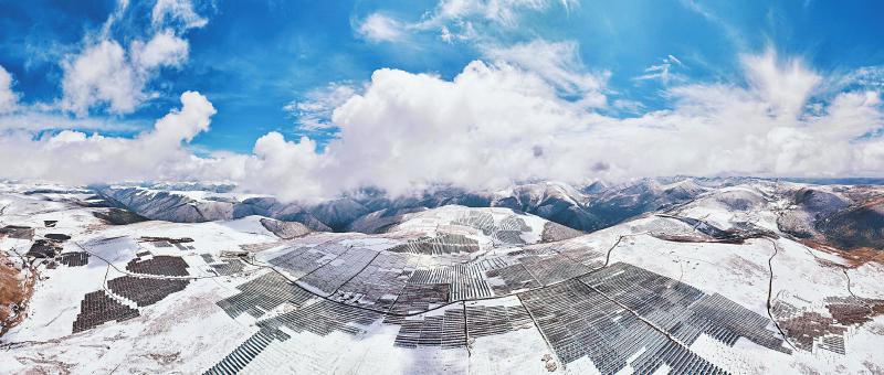 距兩河口水電站約50公里的柯拉一期光伏電站,200多萬塊光伏板將最高海拔4600米的扎拉托桑山裝點成一片“光伏海”。