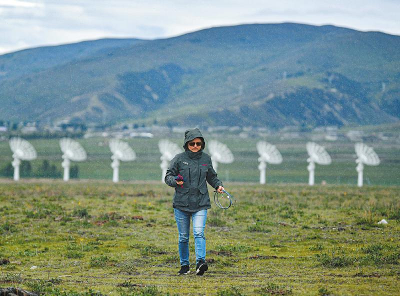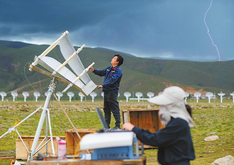 7月8日,四川省甘孜州稻城縣噶通鎮(zhèn)天氣說變就變。在國家重大科技基礎(chǔ)設(shè)施——空間環(huán)境地基綜合監(jiān)測網(wǎng)(子午工程二期)圓環(huán)陣太陽射電成像望遠(yuǎn)鏡項(xiàng)目建設(shè)現(xiàn)場,中國電科第39研究所現(xiàn)場施工負(fù)責(zé)人葉愛林和同事正在進(jìn)行天線增益調(diào)試實(shí)驗(yàn)。突然,一道閃電劃過天際,轟隆隆的雷聲過后便是傾盆大雨,葉愛林和同事不得不停下手中正在進(jìn)行的實(shí)驗(yàn),臨時(shí)找地方躲雨?!斑@雨下不了多久,等雨停了,我們再繼續(xù)?!痹陧?xiàng)目建設(shè)現(xiàn)場已工作了480多天的他,被同事們稱作半個氣象“土專家”。他不僅能“察言觀色”看懂高原上的云彩,還能大差不差地推測出天氣變化。在海拔3800多米的噶通鎮(zhèn),許多科研人員像葉愛林一樣,默默奮戰(zhàn),希望在建的這一國家重大科技基礎(chǔ)設(shè)施能早日運(yùn)行,為中國空間科學(xué)事業(yè)的發(fā)展提供關(guān)鍵性的探索幫助及技術(shù)支持,使我國步入世界空間科學(xué)領(lǐng)域的先進(jìn)行列。